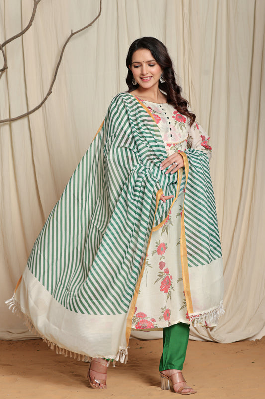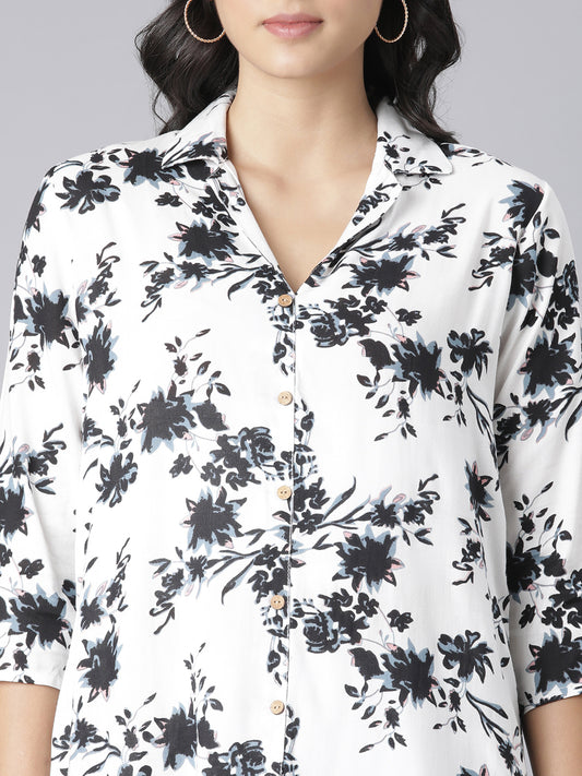 White and Green Floral Printed Short Kurti with Mandarin Collar and Button Detailing
