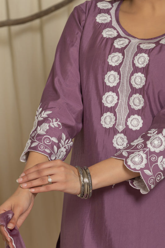 Royal Violet Roman Silk Suit Set With Beautiful Mirror And Thread Embroidery