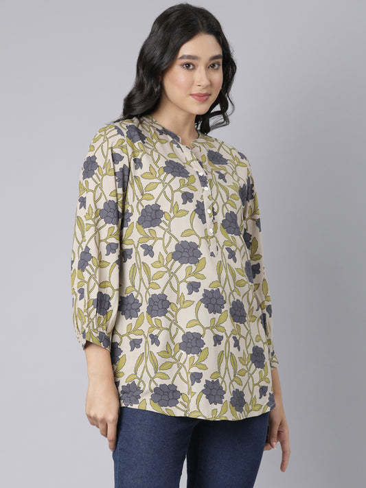 Olive Bloom Notch Neck Short Kurti with Grey Floral Print and Buttoned Placket Detailing