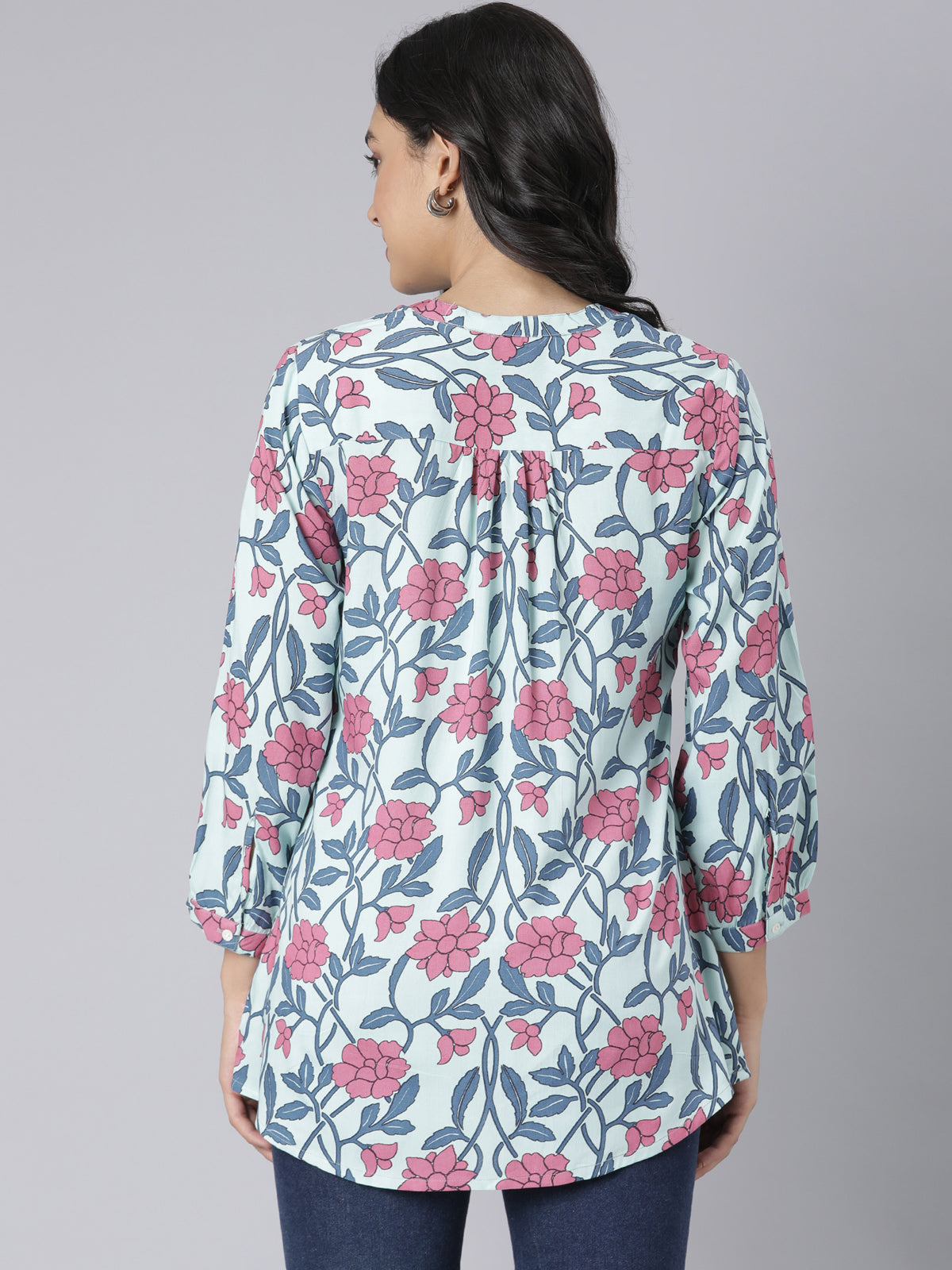 Blush Garden Notch Neck Short Kurti with Pink & Blue Floral Print