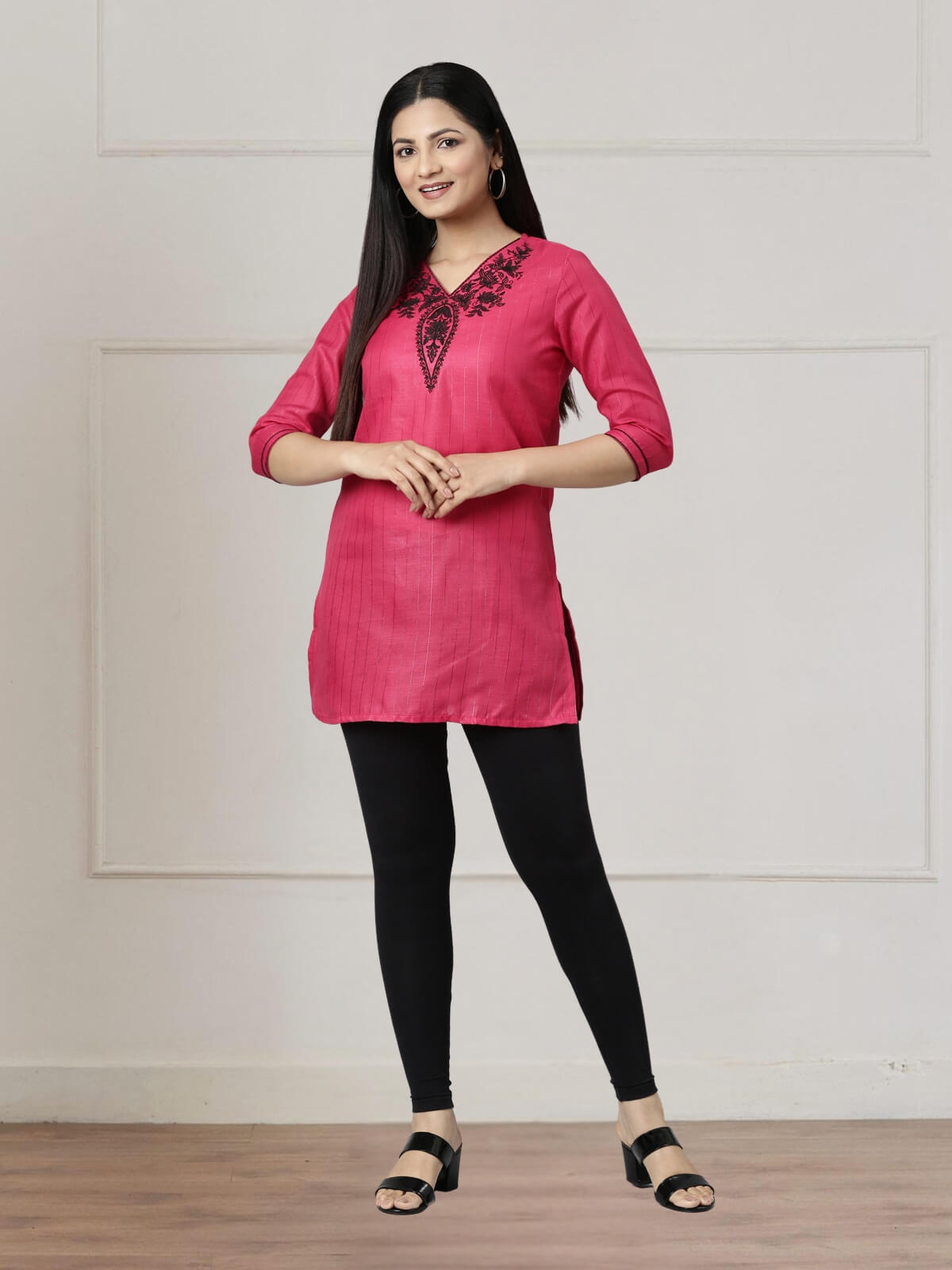 Dark Pink Short Kurti With Neck And Sleeve Embroidery