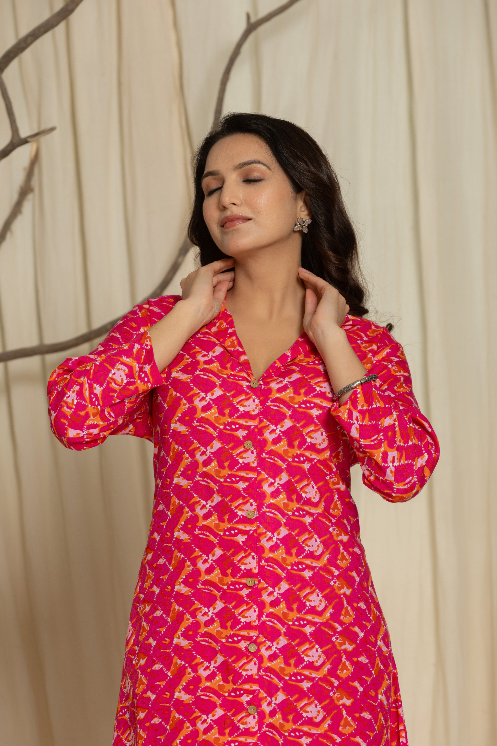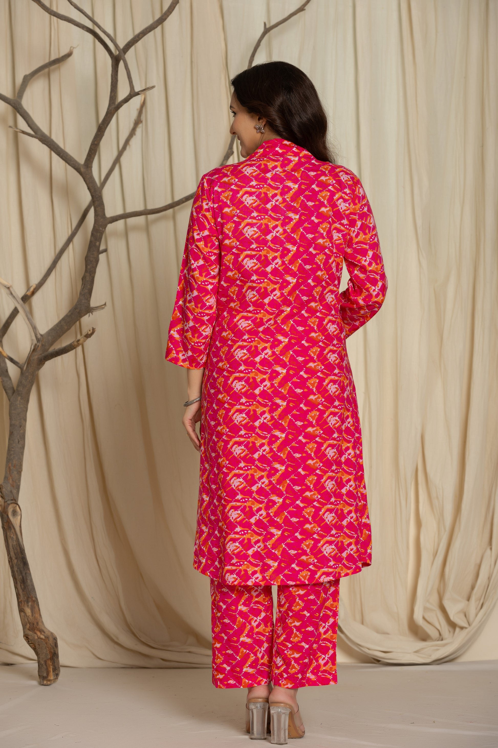 Make a stylish statement with this Hot Pink Cotton Printed A-Line Co-Ord Set that perfectly balances comfort and elegance.