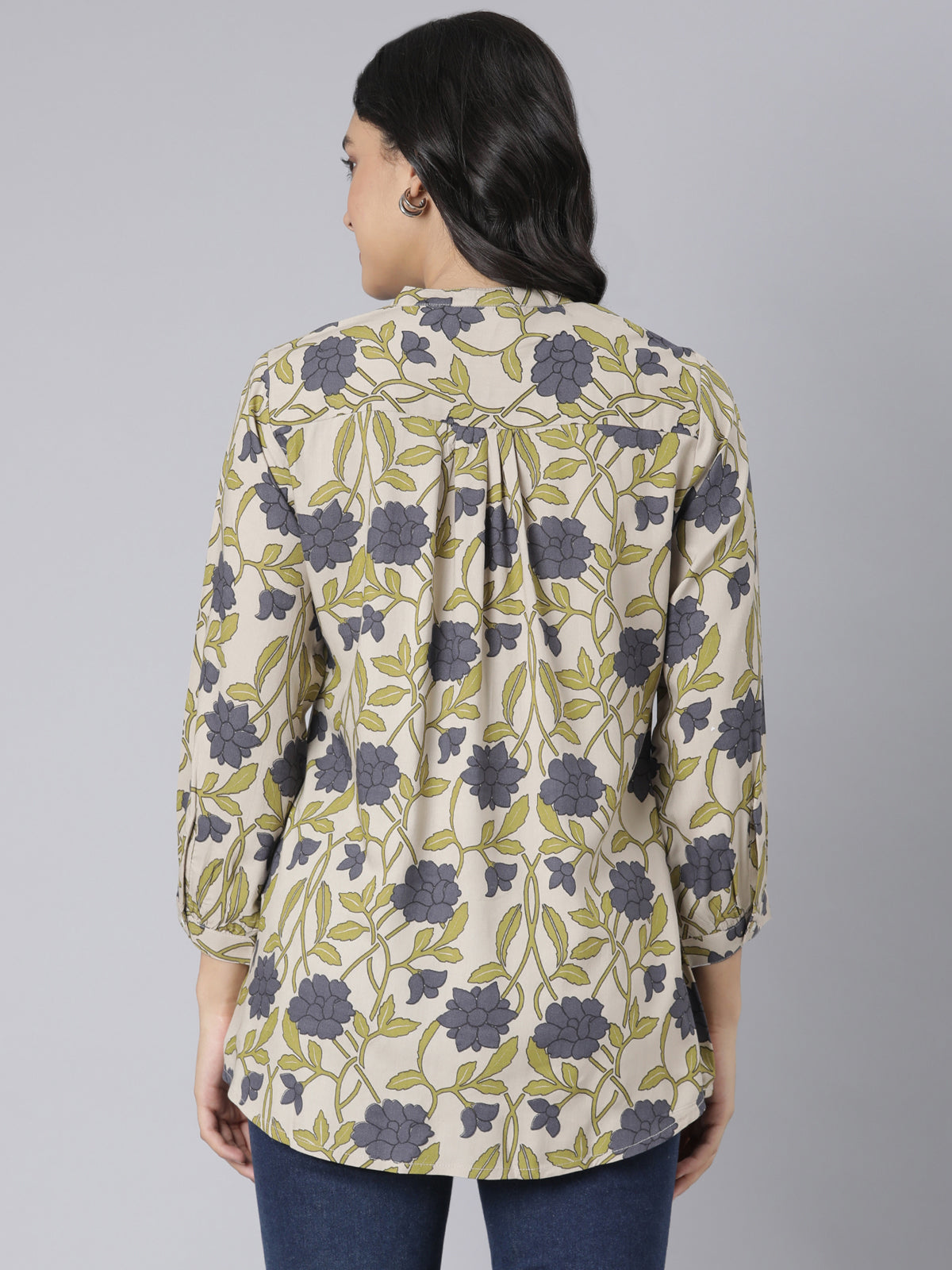Olive Bloom Notch Neck Short Kurti with Grey Floral Print and Buttoned Placket Detailing