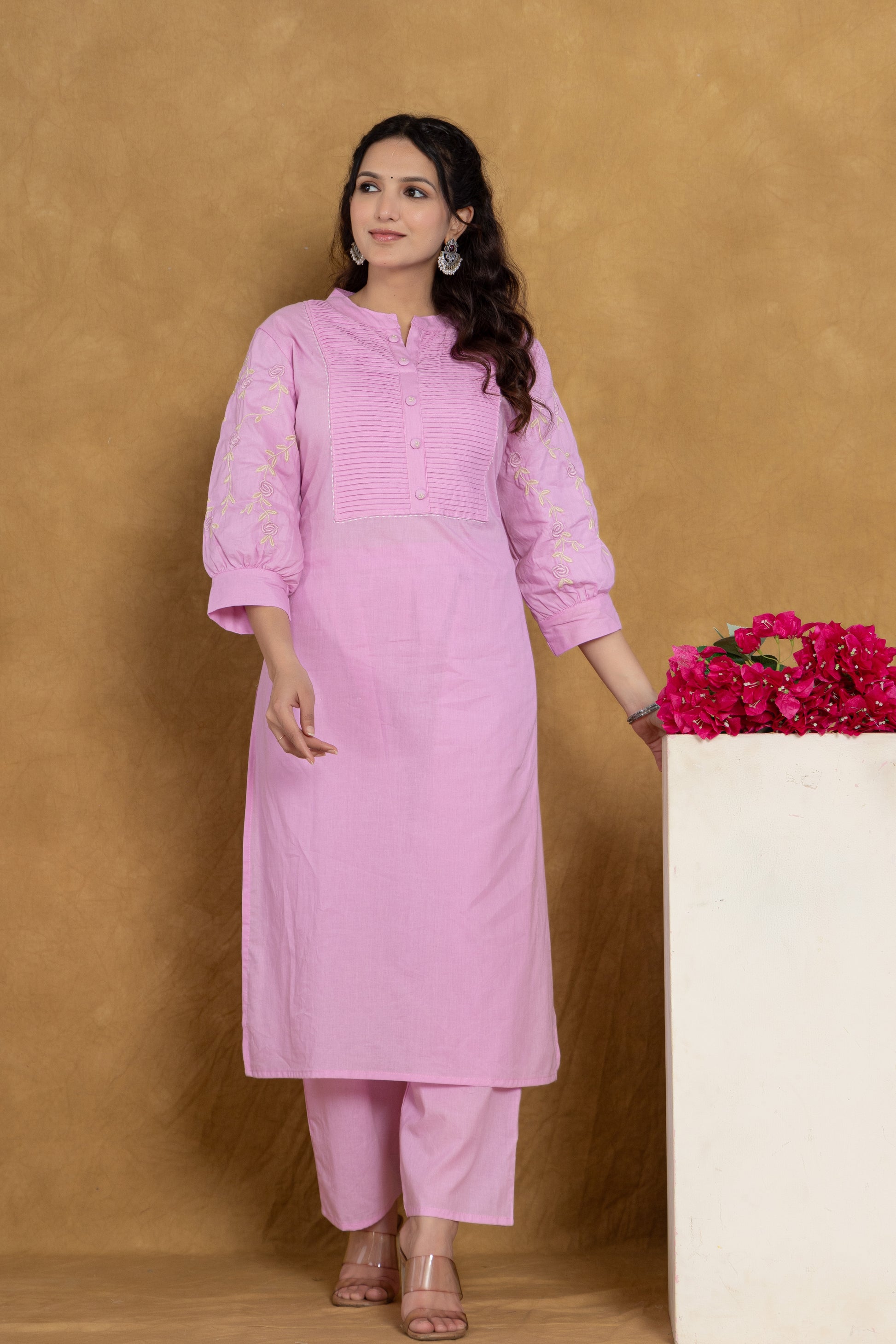 Pink Cotton kurti Set with Embroidery & Pintex Detailing