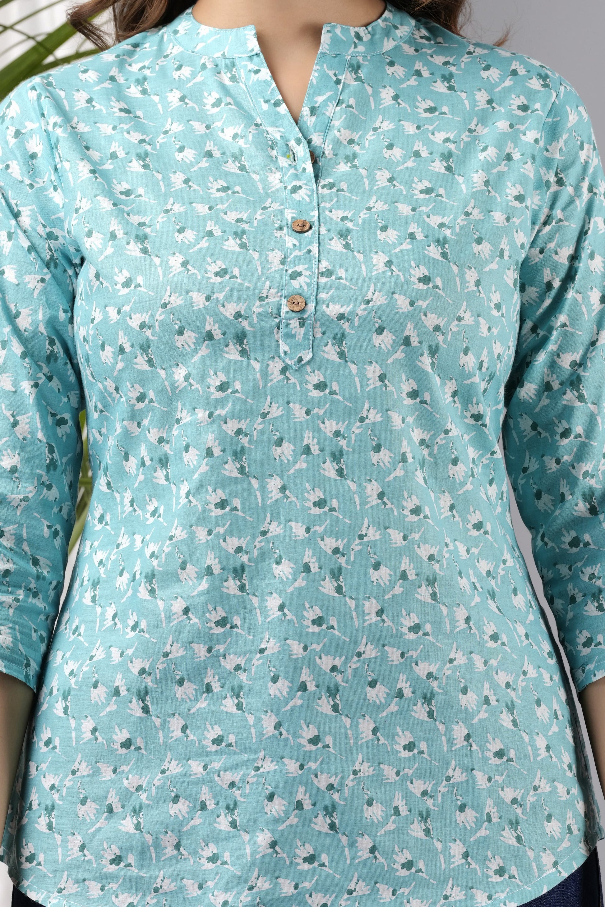 Sea Green Mandarin Collar Short Kurti With Tropical Abstract Print