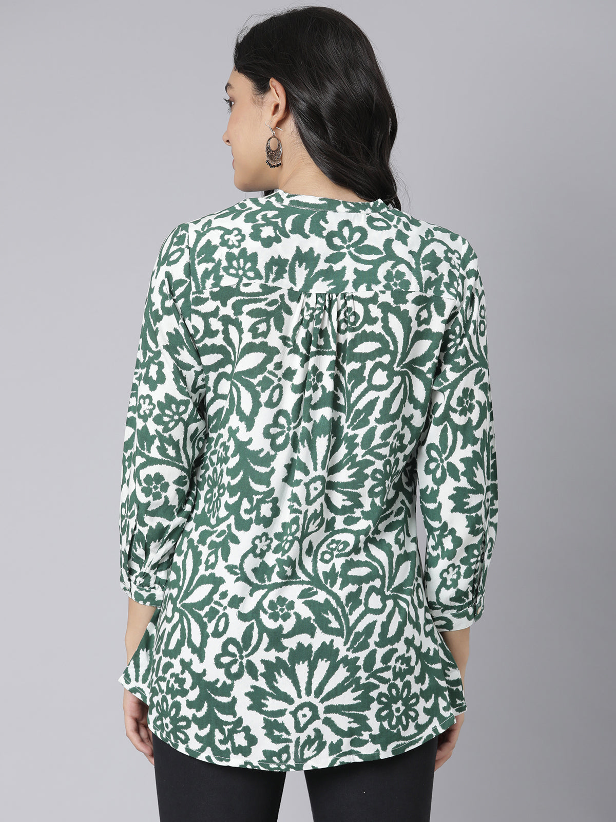 White and Green Floral Printed Short Kurti with Mandarin Collar and Button Detailing