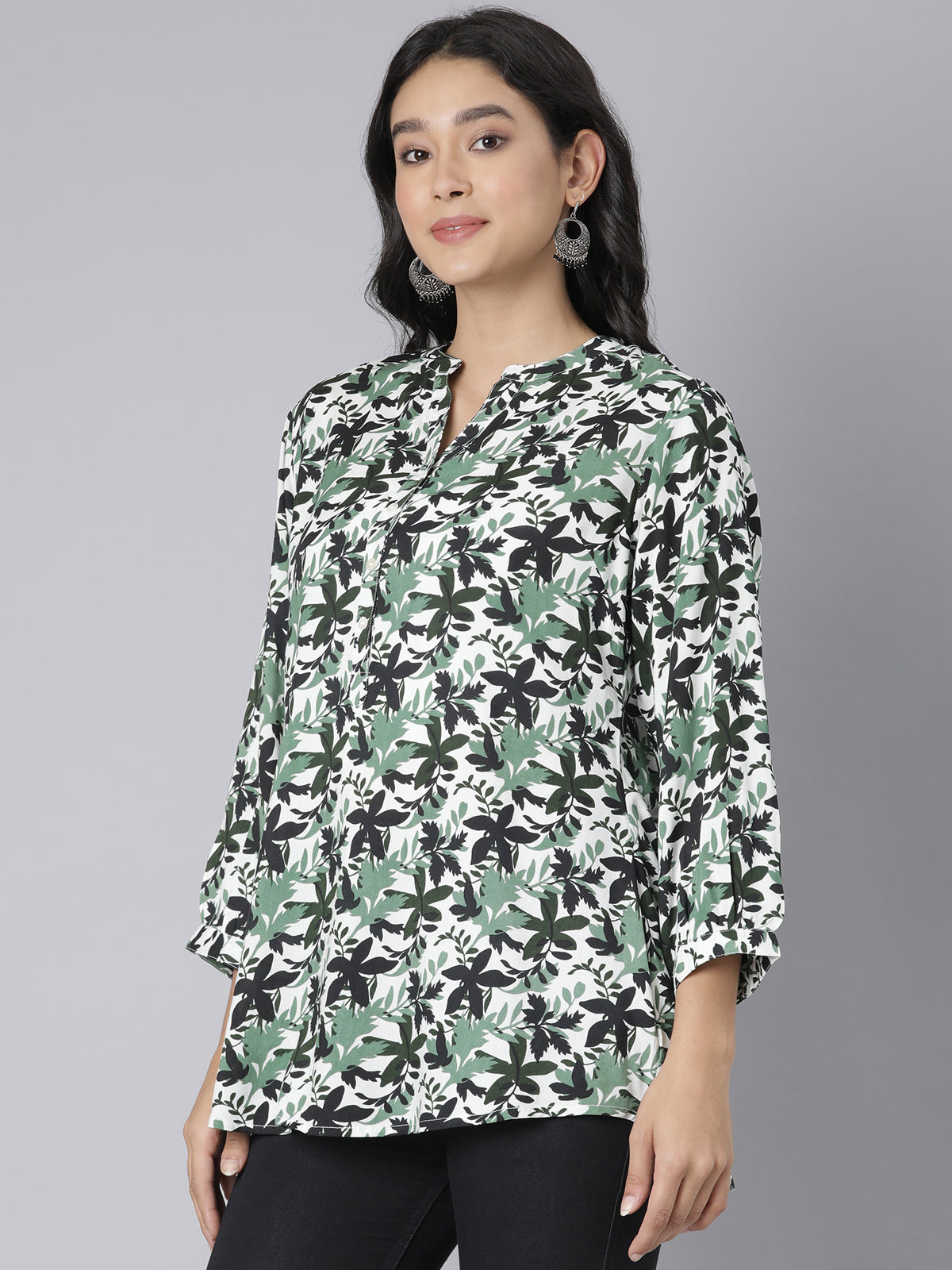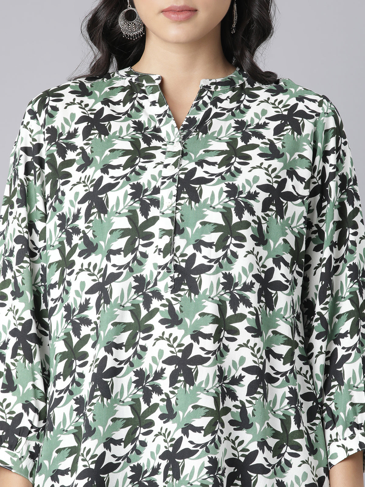 White and Green Leaf Printed Short Kurti with Mandarin Collar and Button Detailing
