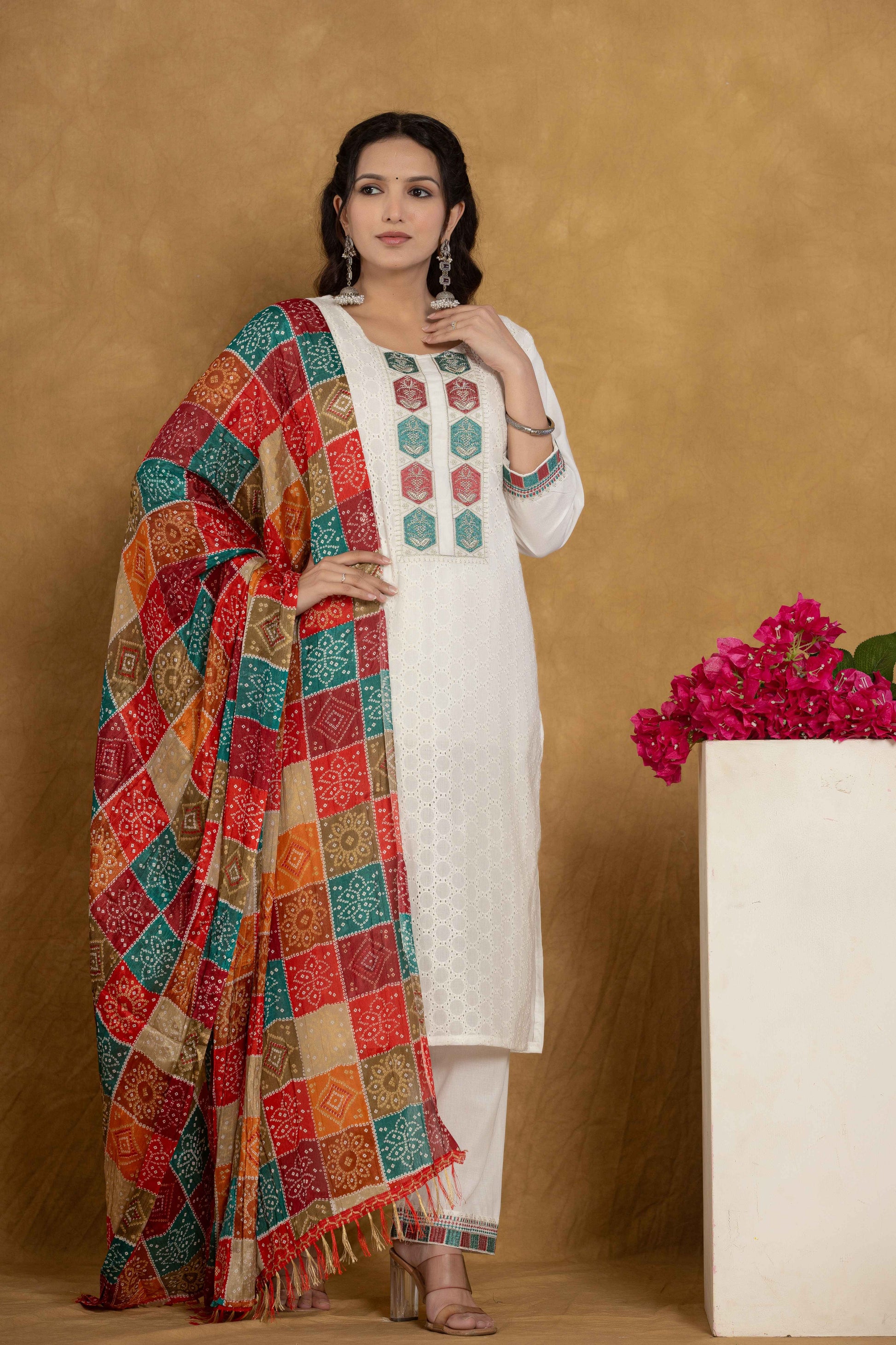 White Chikankari Suit with Floral Motifs, Matching Pants, and Bandhani Printed Dupatta
