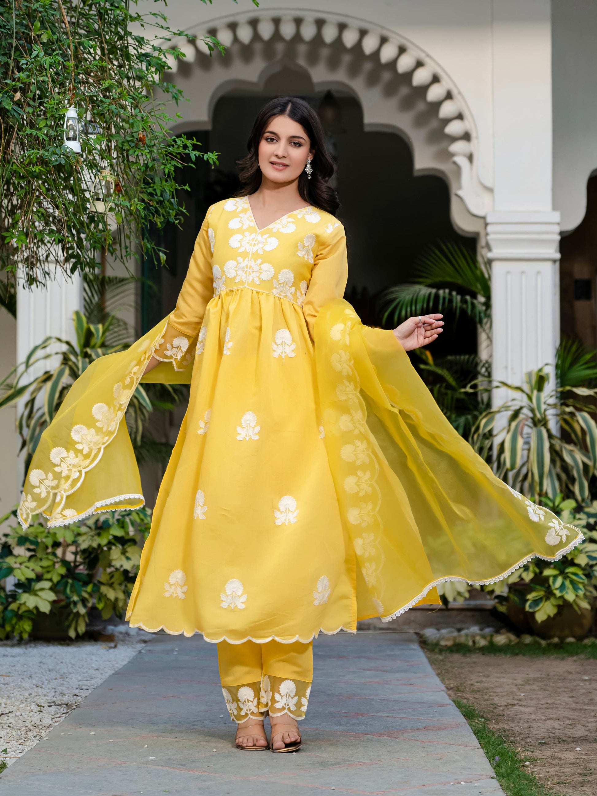 Yellow Floral Embroidered V-Neck A-Line Kurta With Trouser & Dupatta